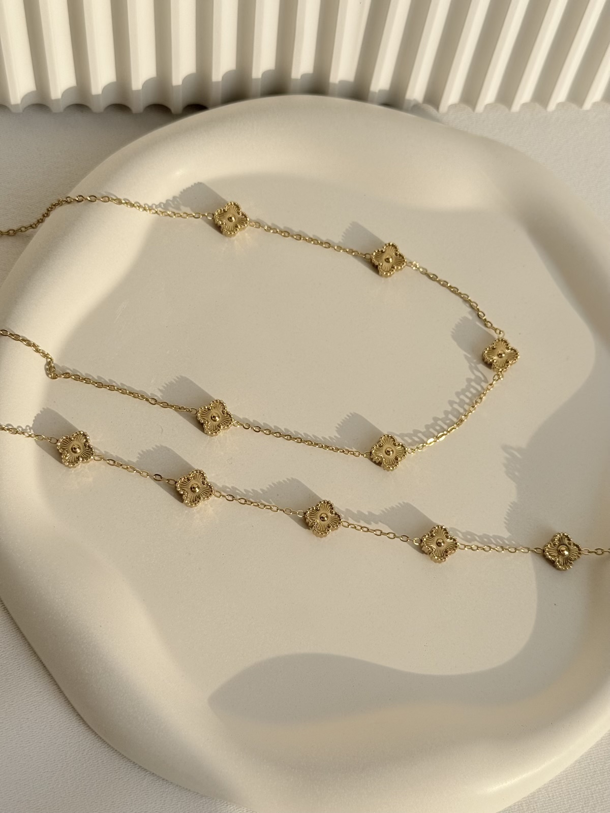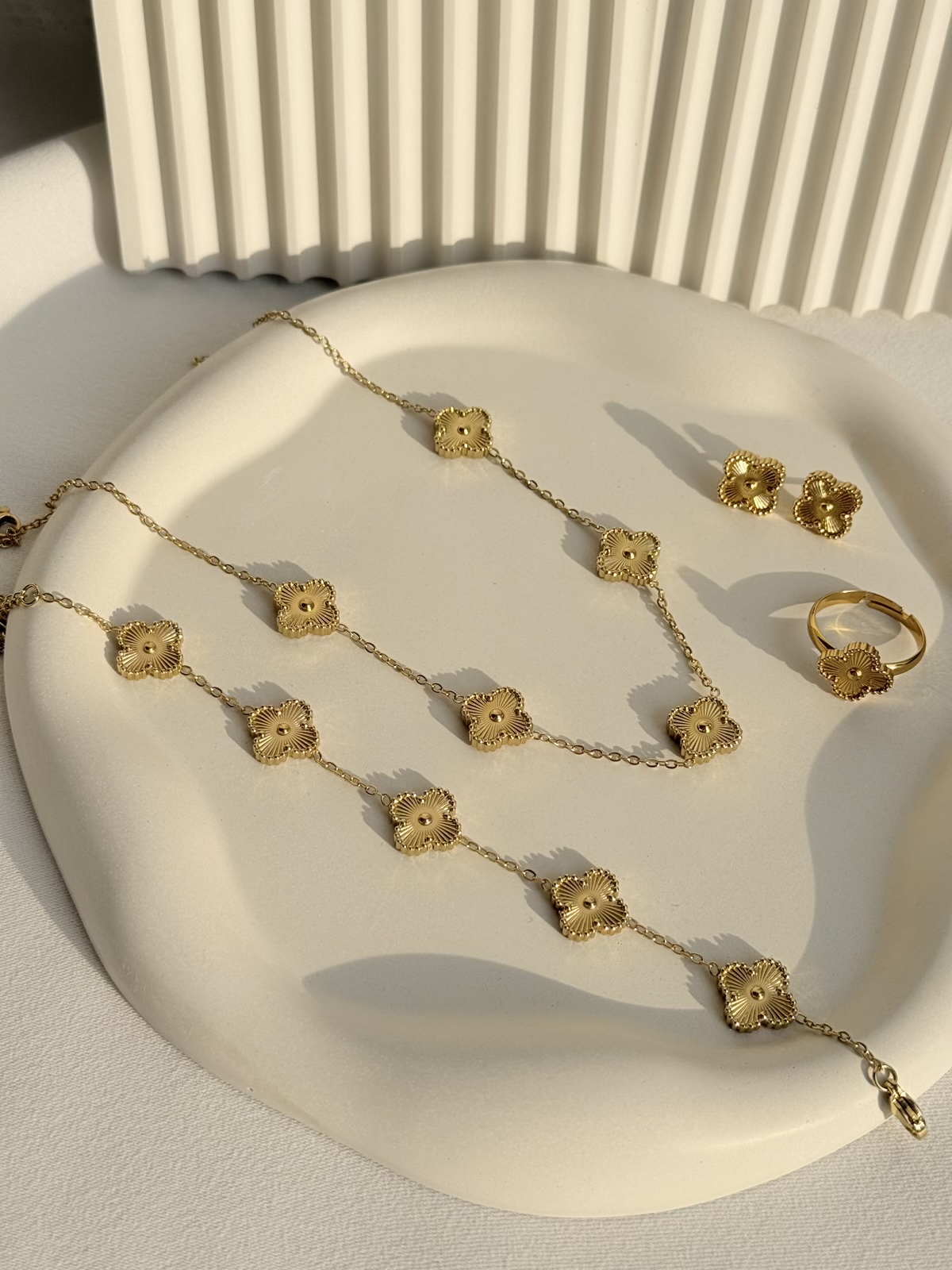 متریال تماما استیل رنگ ثابت ضد حساسیت گردنبند و دستبند : پنج سانت زنجیر اضافه تنظیم سایز انگشتر فری سایز گوشواره میخی (گوشواره و انگشتر گل درشت دارند)